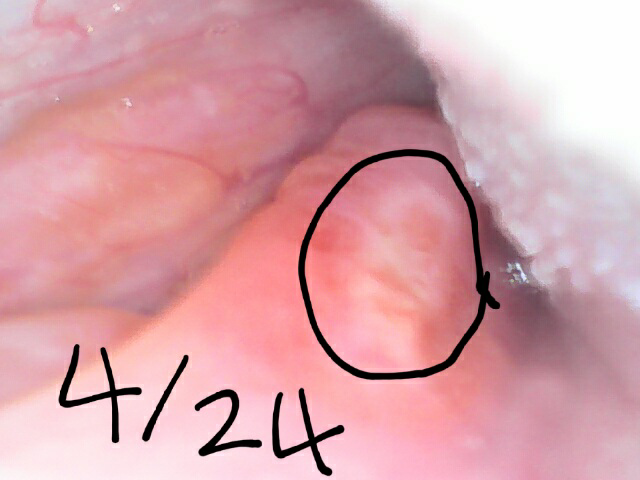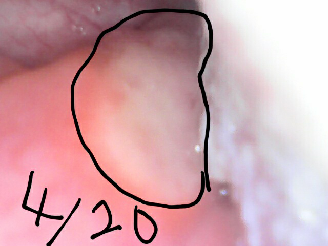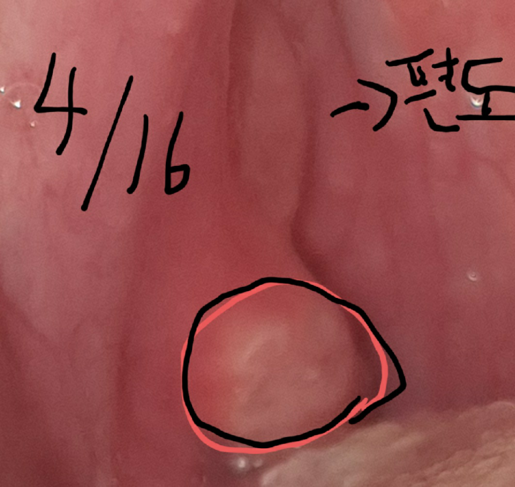 7일전에 밥과 물마시는데 목이 너무따가워서 카메라로 확인해보니편도 아랫부분(구개설궁)에 구내염 처럼 너무너무 따끔거리는 병변이생겼는데 비타민이랑 알보칠 지지면서 버티고있어요
