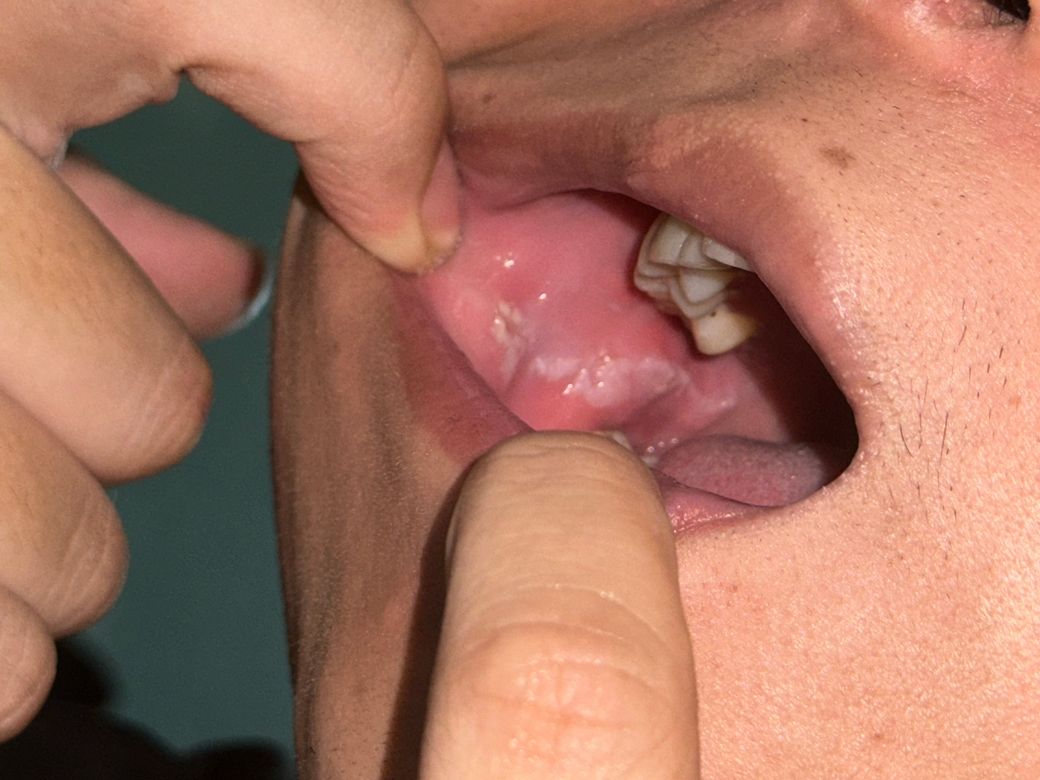 이게 구내염인지 사진 맨왼쪽 흰색부위에 밑에 이빨하나가 없는데 그거때문인지 궁금해서 여쭤봅니다