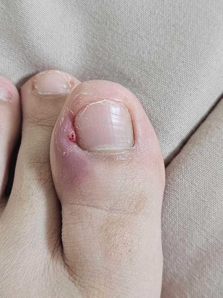 현재 해당 부위 발가락 주변의 살점이 뜯기면서 염증이 발생한 조갑염 상태가 의심됩니다. 항생제 치료 및 배농술이 필요할 수 있으니 가까운 정형외과 진료 권유드립니다.