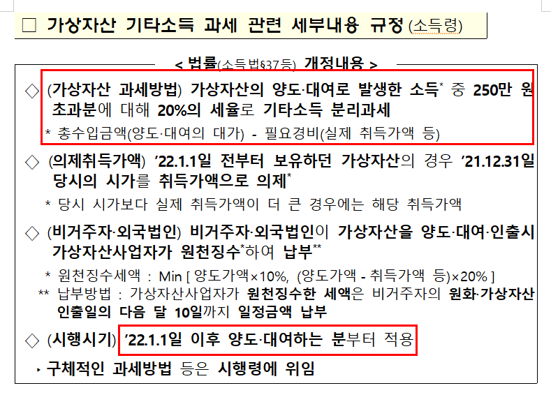 질문하신 내용에 대하여 아래와 같이 답변 드립니다.2021년 이전의 가상자산은 2022년에 매도시 차익발생시 기타소득으로 과세됩니다. 다만 그 전부터 보유하고 있던 금액은 기타소득과는 무관하며 재산취득자금 출처 조사시 소명하여야 하는 부분으로서 당면한 문제는 아닙니다.