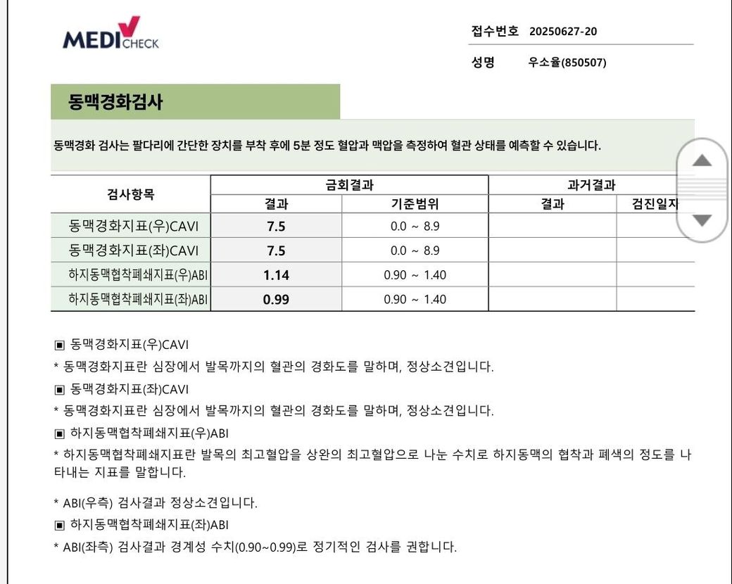 건강검진에서 하지동맥협착폐쇄지표에서 왼쪽 다리만 경계성 수치가 나오기도 했어요.