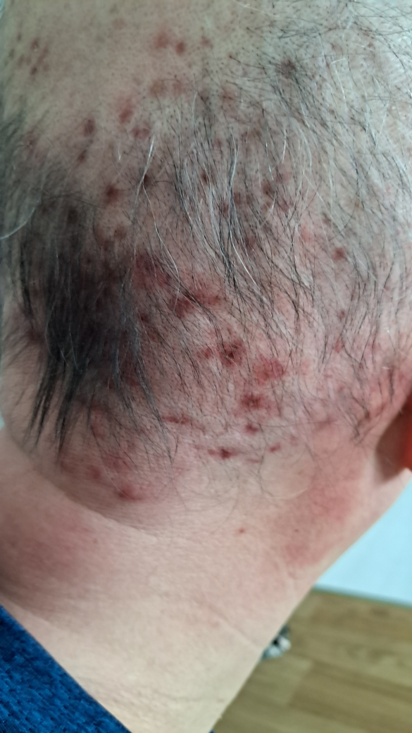 박테리아 또는 곰팡이 감염으로 인해 피부에 이러한 증상이 나타날 수 있으며, 때때로 적절한 치료 없이는 증상이 악화될 수 있습니다. 장시간 헬멧 착용과 같은 물리적 자극이 원인이 되는 접촉성 피부염의 가능성도 고려해야 하겠습니다. 피부과 전문의 상의하에 치료를 이어나가시기 바랍니다.