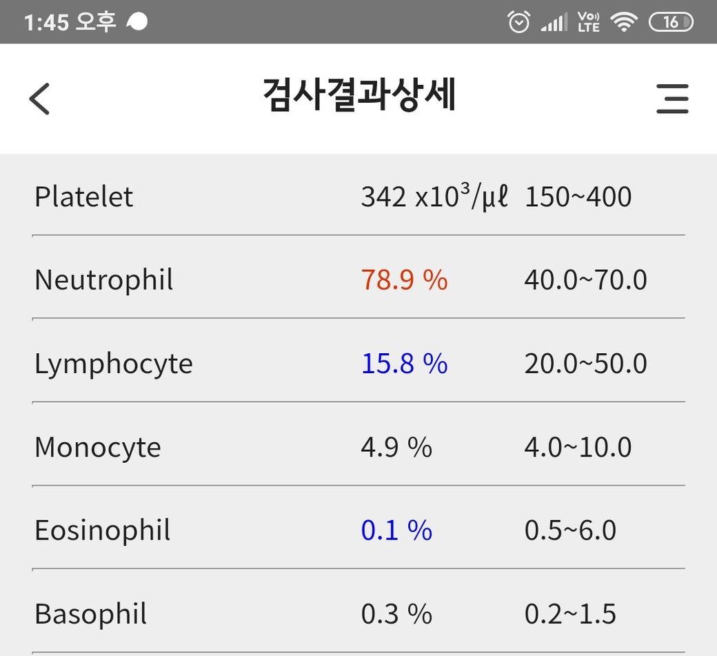 백혈구 수치가 중요하기는 하지만 호중구나 임프구, 호산구의 비율이 조금씩 차이가 나는 것은 별로 의미가 없습니다.