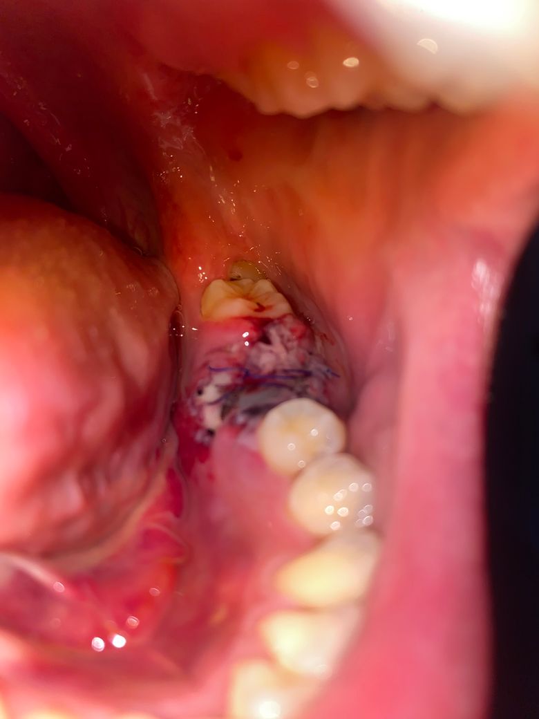 염증이 잇몸뼈를 다 녹여 어금니 발치후 상당량 뼈이식을 한 상태입니다. 4일차인데 실도 느슨해보이는게 풀린지 궁금하고, 원래 아무는 과정에서 저렇게 검고 하얀 얼룩같은게 지저분하게 보이는게 정상인건가요?