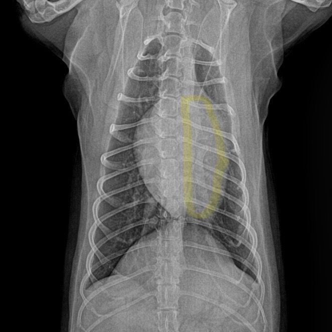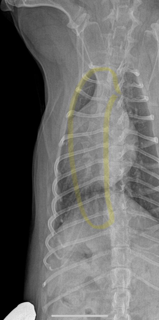 이전에 이미 몇차례 말씀 드린것처럼 촬영상의 rotation에 의해 일어난 artefact 즉, 허상에 해당하며 정상적인 현상입니다. 몇차례 반복해서 말씀 드린 내용이 믿음이 안가신다면 다른동물병원에 가셔서 가슴쪽 엑스레이를 다시 찍어 보시거나 주치의의 이야기 대로 CT 촬영을 해보시면 됩니다.