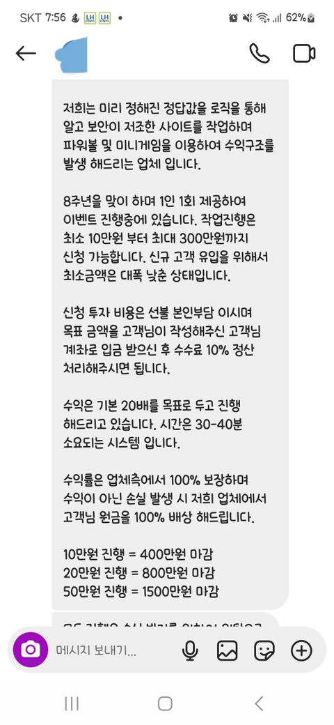 100프로 사설토토 및 불법도박입니다. 저렇게 문자오는 것들은 다 불법입니다. 그러니 접속 안하는것이 상책입니다. 드가지마세요