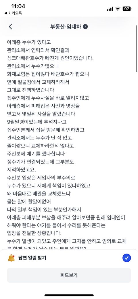 월세 누수관련 책임문제 어떻게 해야하나요?
