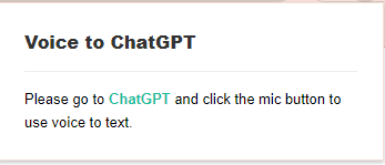 그리고 구글 크롬에 확장프로그램으로 깐 Speak-to-chatGPT를 클릭하면 아래와 같은 사진이 나오는데, 클릭하면 mic 버튼이 없고, 그냥 chat 메시지 입력하는 것만 나옵니다