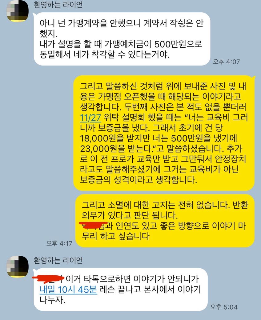 위탁 설명회에서 교육비 500만원이라는 언급이 나왔는데 이때 “교육비 500만원은 보증금이다. 교육비 500을 지불하면 초기 3개월동안에 30분 레슨당23,000원 지불하지 않으면 18,000원이다. 너는 500을 지불했으니 위탁 운영 시 보증금 500만원을 제외한다.”라는 이야기를 했고 그 이야기를 듣고 당연히 보증금이라고 하셨기에 제가 입사 전 낸 교육비는 돌려받는 금액이라고 생각을했습니다. 위탁 운영의 경우
