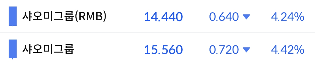 샤오미그룹의 rmb의 경우, 홍콩 시장에 상장되어 있기는 하나 CNY로 거래가능한 샤오미그룹 주식입니다.