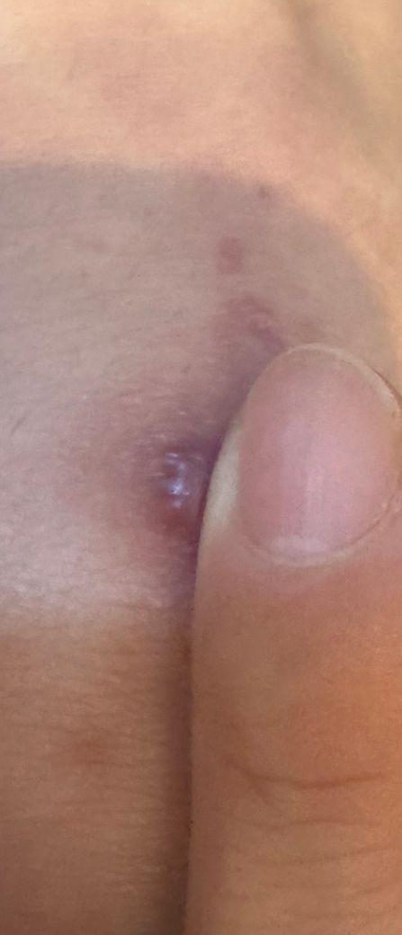 올려주신 사진에서 병변이 또렷하게 확인되진 않으나 물집은 아닌 것으로 보이며 물집이 생긴 경우에도 억지로 터트릴 경우 감염이 문제가 될 수 있으므로 손을 대지 말고 청결하게 관리하며 소독과 습윤 밴드의 부착을 권합니다.