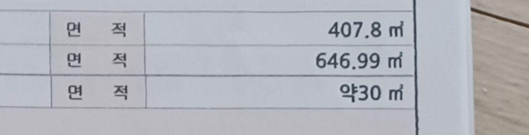 면적이 총 3개인데요 이 중에서 제가 살고 있는 집(원룸)의 면적만 나온 게 세번째 약 30제곱미터라고 쓰여있는 것 맞나요? 첫번째 407.8제곱미터 두번째 646.99제곱미터는 무슨 면적이지요?