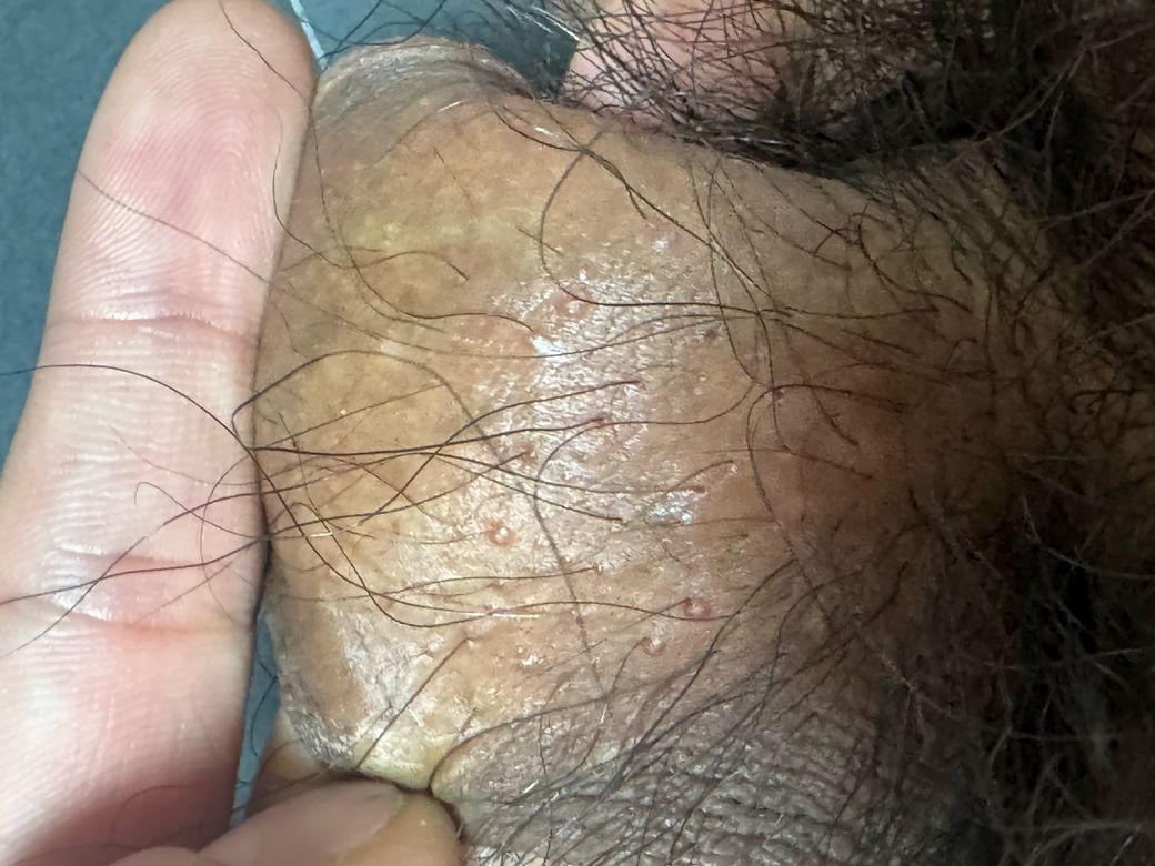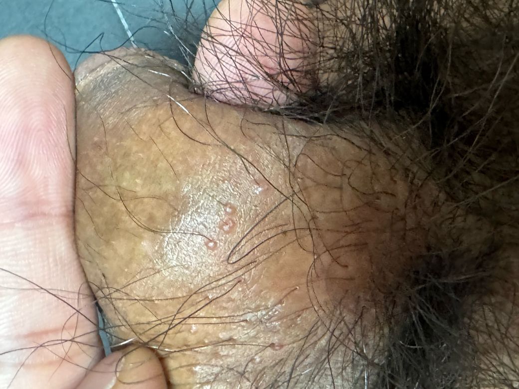 사진상으로는 성기 기둥의 털이 나는 부위에 작은 구진·미세한 수포처럼 보이는 병변이 산재해 있고, 뚜렷한 통증이나 화끈거림은 없어 보입니다. 이 양상만으로 보면 헤르페스 2형보다는 모낭염이나 피지선 염증, 또는 마찰·습기로 인한 자극성 피부염 가능성이 더 높아 보입니다. 헤르페스는 보통 여러 개의 맑은 수포가 군집해 나타나고, 따끔거림·화끈거림·통증이 동반되는 경우가 많으며 수일 내 궤양이나 딱지로 진행하는 양상이 흔합니다.