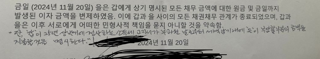 갚았다는 영수증을 쓰라고 해서 쓰고, 현재 회생에 문제가 생겨 채권채무를 포기하겠다는 법원에 제출할 각서 같은 것도 쓴 상황입니다.