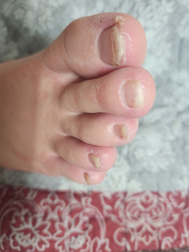 사진 상 각질과 갈라짐, 발톱 두꺼워짐 등의 소견이 보입니다. 무좀이나 기타 진균감염 가능성이 높습니다. 특히 통풍 안 되는 슬리퍼와 물기 있는 환경은 증상을 악화시킬 수 있습니다. 진단 이후 연고 또는 경구약물로 된 항진균제 처방이 필요하겠습니다. 통풍이 잘 되는 슬리퍼로 교체하시는 것을 권하며 발을 씻은 후엔 반드시 완전히 말리시고 항상 건조하게 유지하셔야 합니다. 슬리퍼와 신발을 소독하거나 교체하시고 양말은 자주 갈아신기 바랍니다.