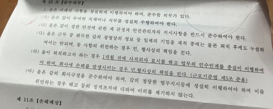 1. 이론상 1개월 이전에 임의퇴사한 때는 상기 근로계약서상의 내용처럼 손해배상 책임을 지는 등 법적책임을 질 수 있으나, 실제 사용하자가 손해배상을 청구하기는 어렵습니다.