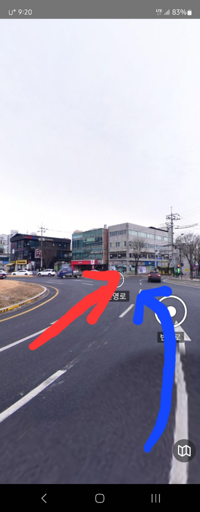 저는 오토바이(빨간색 화살표)로 1차선 주행중에 번영로 방면으로 진출하려고 했고 상대차량 스타렉스(파란색 화살표)도 저랑 같이 진출하려는 듯 보였으나 깜빡이도 안켜고 갑자기 제 쪽으로 끼어들어 클락션을 울린 후 제 오토바이가 쓰러져 넘어져 비접촉사고가 발생했습니다