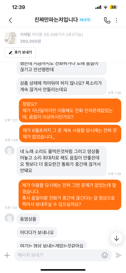 다음날 11일경 구매자분께서 전화상에 음질이 이상하다며 환불을 요구하였습니다. 저는 해당 휴대폰을 6월초까지 사용하였고 제가 사용할 당시 전화상의 문제는 전혀 없었습니다. 그래서 환불은 힘들다고 하였고 현재 그분이 경찰에 저를 신고한 상태입니다.