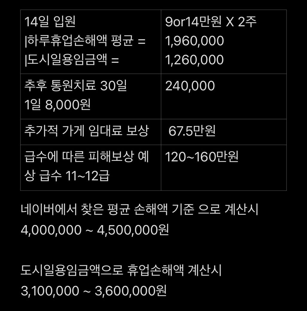 Q. 미용업이라 인테리어 > 영업신고 > 사업자 > 영업시작 순서라 사업자가 없을 뿐더러 가게 임대료를 내고 인테리어 진행중입니다. 신규오픈 매장이라 일 수익이 안잡히며, 제 가게에 피해가가는 부분을 상가임대차계약서를 통해서 휴업손해액을 청구할 수 있나요 ? 현재 병원에 와있으며 2주 입원 이야기 후 통원치료 권유 받았습니다.