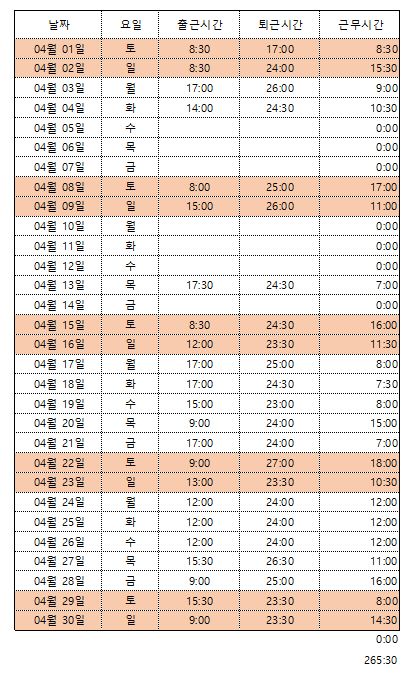 참고로 4월 근무한 시간표입니다.