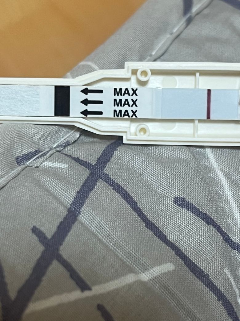 사진으로는 확인이 어렵습니다. 대조선(C)만 확인되고 시험선(T)은 사진에 포함되있지 않아보입니다. 실제 시험선이 매우 연하게 보인다면 시약이 비쳐서 보일 가능성도 있습니다.