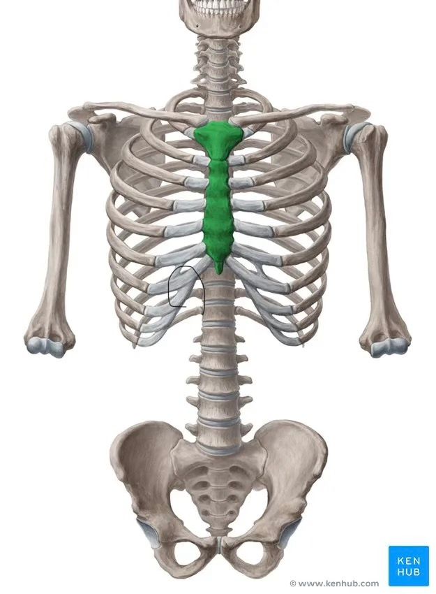 우선 사진에 표시된 부위는 흉골로 흉골과 갈비뼈가 만나는 갈비뼈 연골의 염증이 생겼거나 가슴 근육의 근육통 가능성이 있습니다.