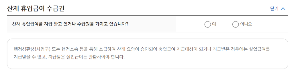 설명중 "행정심판(심사청구) 또는 행정소송 등을 통해 소급하여 산재 요양이 승인되어 휴업급여 지급대상이 되거나 지급받은 경우에는 실업급여를 지급받을 수 없고, 지급받은 실업급여는 반환하여야 합니다."라고 되어 있습니다.