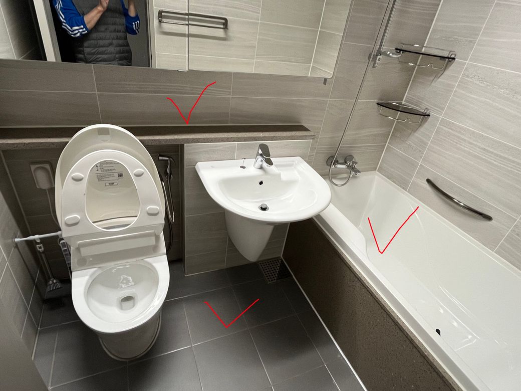 사진의 욕실 구조를 봤을때, 라돈 측정기 위치는 다음 세군데 중 하나를 추천합니다.