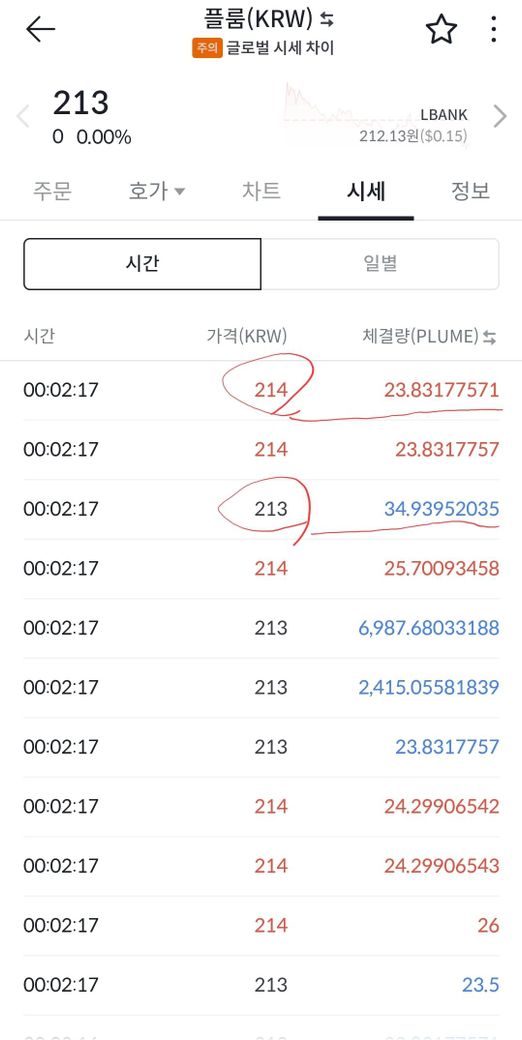 사진은 실시간거래내역인데 빨강은 매수? 파랑은 매도인가요? 빗썸 화면인데 왜 시세는 214인데 213으로 낮은가격에 매도? 214의 시세에 매수가 체결됏단건가요?
