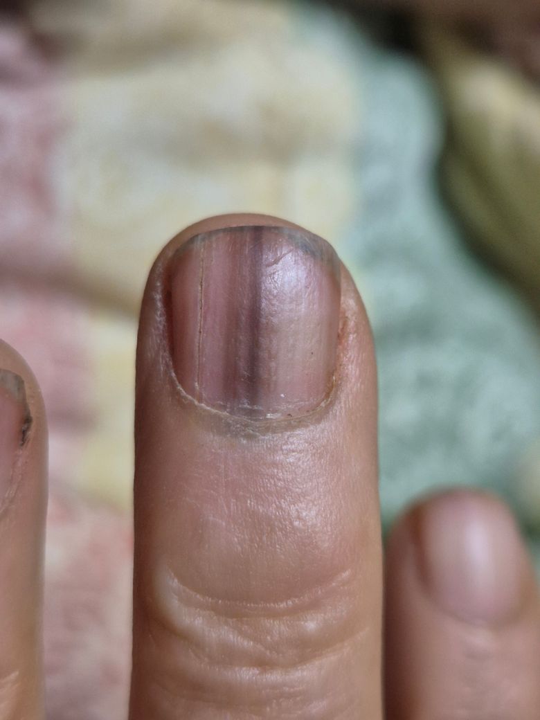 어디 부딪히신게 아니라면 우선 손톱에 검은색 세로줄은 멜라닌 라인일수 있습니다. 멜라닌은 피부와 손톱의 색을 진하게 만들어주는 색소입니다. 때로는 손톱에 멜라닌이 집중되어 세로줄 형태로 나타날 수 있습니다.