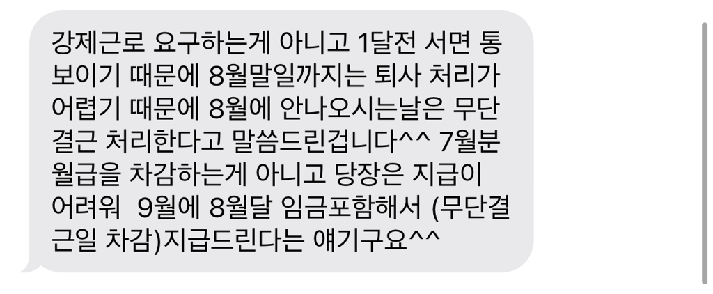7월 월급을 차감해서 주겠다는 뜻이고, 노동부에 바로 신고하시는 게 좋겠습니다. 변호사 어쩌고 하는 소리는 그냥 무시해도 됩니다. 계속 나오라고 하는 건 거부하면 되고 그런 걸 강제 근로라고 하지 않습니다.