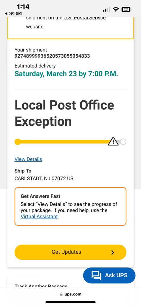 UPS 배송 현황에서 "local post exception"이라고 뜨는 경우, 미국 내 우체국에서 배송에 문제가 발생했다는 의미로 볼 수 있으며, UPS 배송 현황에 "local post exception"이 표시되는 경우, 우체국 시스템의 오류 또는 사고가 있을 수 있으므로, UPS에 문의하여 배송 상태를 확인하는 편을 권고드립니다.