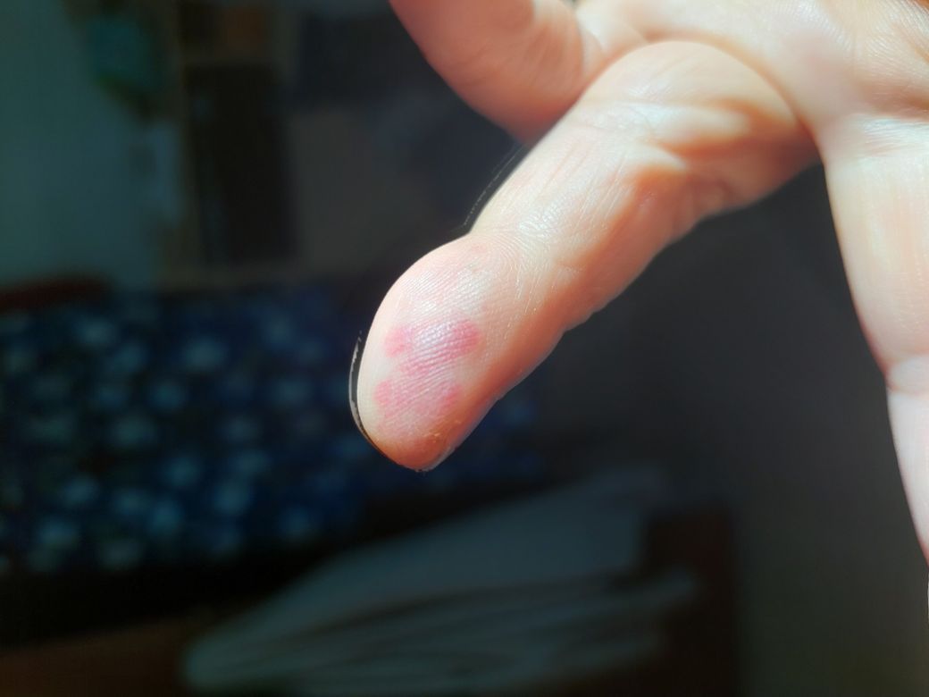 아무래도 손가락 끝에 발생하고 붉은 색 반점과 끝에 피부가 벗겨지는 모습을