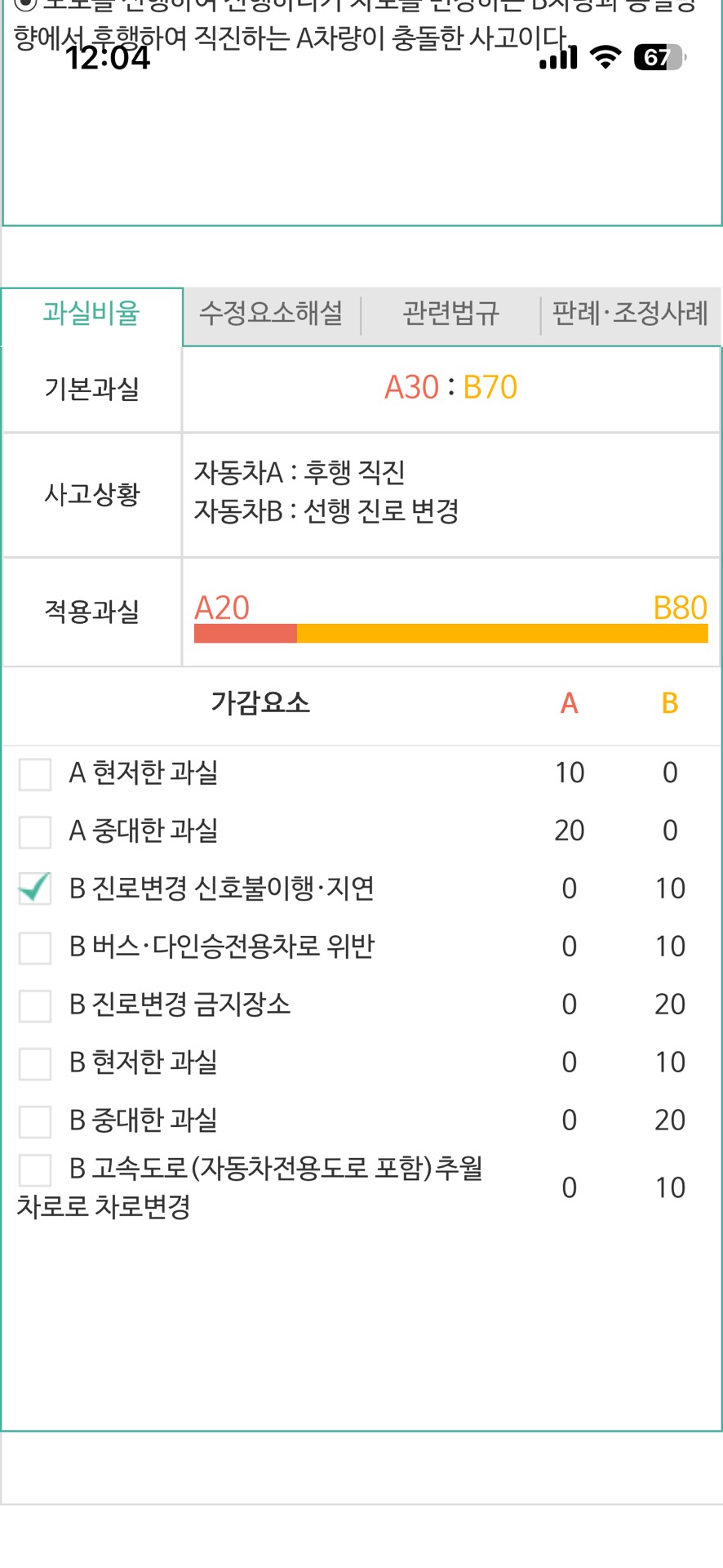1명 평가위와 같은 사고에서 상대 보험사는 차선 변경 기본 과실 70%에 2개 차선 연속 변경 등의 과실을 가산하여
