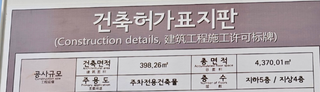 상기 사진과 같이 주용도가 "주차전용건축물"로 나라에서 시공허가를 받은 것으로 기술되어 있으며, 지하 5층 / 지상 4층의 건물로 이루어져 있다고 현재까지 표지되어 있습니다.
