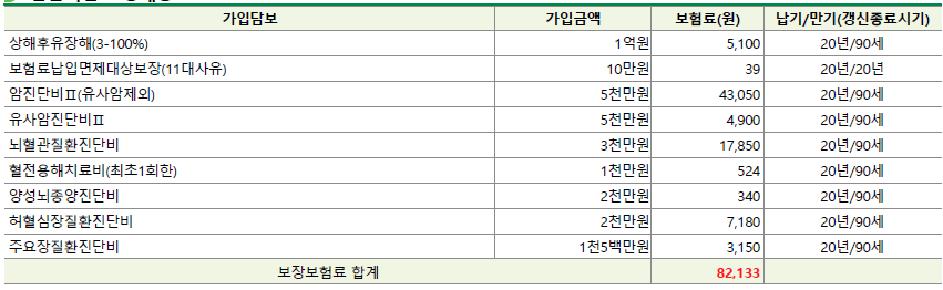 보장 구성(실손보험, 암진단비5천, 유사암진단비3천, 뇌혈관 진단비4천, 허혈성 진단비4천, 질병/상해 종수술비(30~600), 질병후유장해 3천, 상해후유장해 최소1억 이상, 그 외 골절,깁스, 화상 등. 추가로 갱신형인 가족일상생활배상책임보험