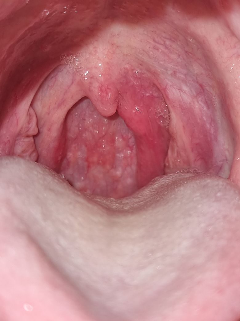 코로나 걸려서 기침을 많이 하다보니 열은 내렸는데 목젖옆이 이렇게 되었습니다