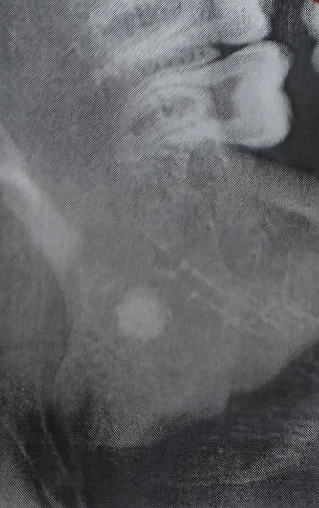 침샘(특히 악하선) 타석은 엑스레이에서 비교적 경계가 분명한 원형 또는 타원형 고음영으로 보일 수 있습니다. 위치가 턱뼈 안쪽, 하악 하연 근처라면 타석증 가능성은 배제할 수 없습니다. 다만 모든 타석이 엑스레이에 보이는 것은 아닙니다.