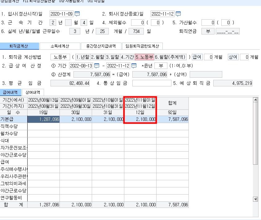 퇴직금 계산은 “실제 지급된 임금총액”을 기준으로 하므로, 만약 11월에 실제로 12일분만 지급했다면, 프로그램에도 반드시 일할계산된 금액을 직접 수정 입력해야 합니다.