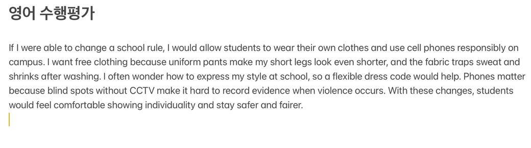 수행평가로 영어 작문을 해가야하는데 아래 조건과 같이 한국어로 글을 써서 챗지피티에게 번역해달라고 하였습니다. 문법적으로 틀린건 없는지 확인했는데 어감상 이상한 부분이 있을까 싶어 여쭤봅니다.