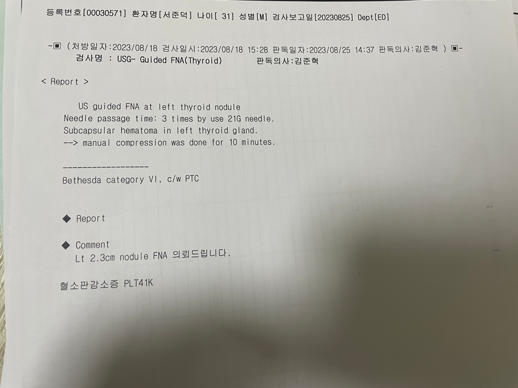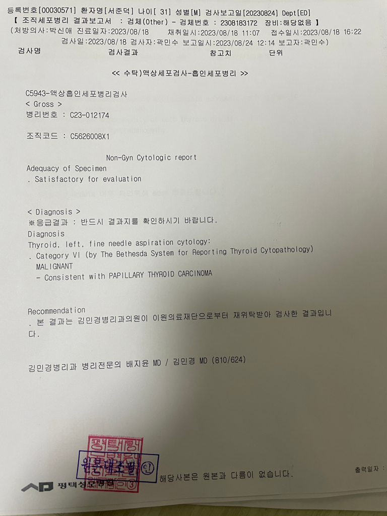 갑상선암 진단을 받아서 많이 걱정스러우시지요. 갑상선 유두암이 진단되셨고, 초음파상에서는 림프절 전이가 의심되는 병변은 보이지 않았습니다. 종괴의 크기는 2.4cm 정도로 보입니다. 병기는 나이가 55세 미만이시고 유두암은 분화암에 속하므로 원격전이만 없으면 1기에 해당합니다. 따라서 병원에서 병기 평가를 위한 검사를 했을 때 전이가 의심되는 부분이 없다면 1기 갑상선암이라 볼 수 있습니다.
