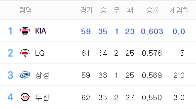 1위 기아, 2위 LG, 3위 삼성, 4위 두산 순입니다.