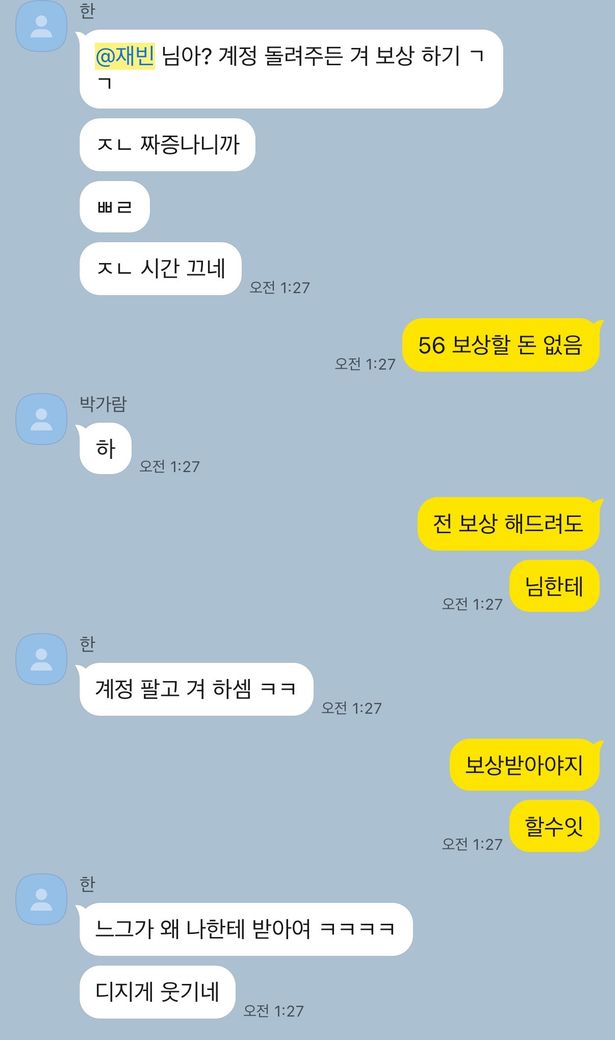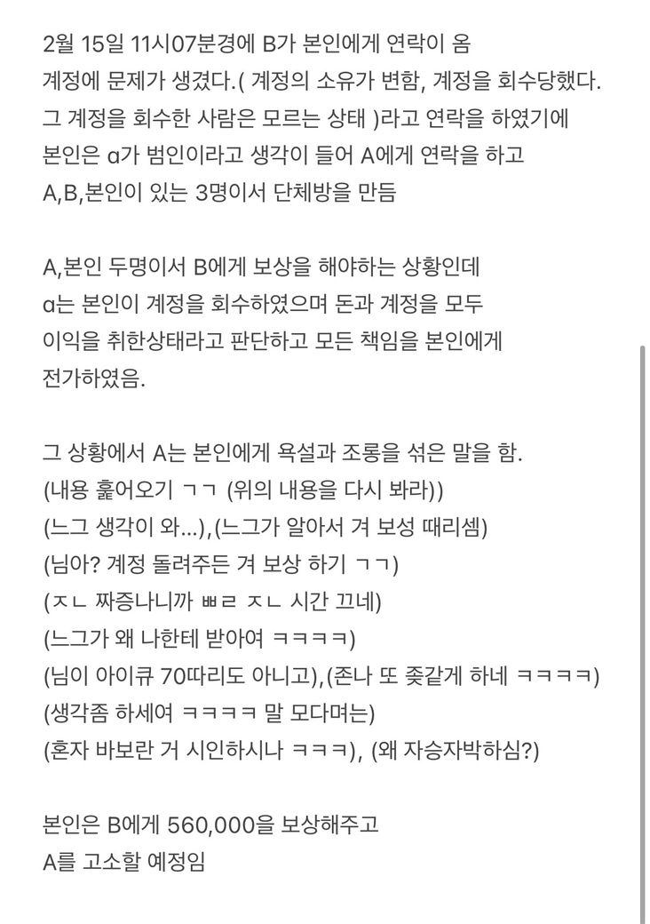 게임 계정 문제때문에 과열된 상황에서 필자에게 욕설을 하고 보상을 해야하는 상황을 회피한 상태인데 고소가 가능한지에 대해 여쭈어봅니다