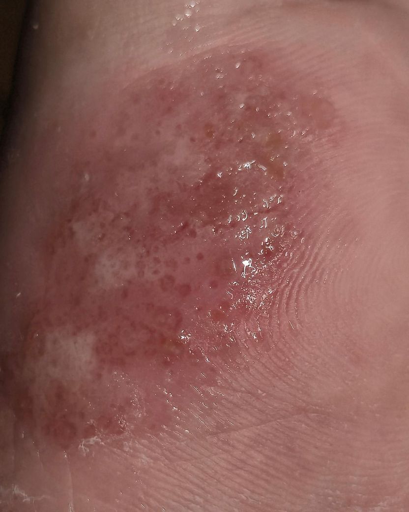 투명한 액체는 체액이 묻어나오는거고 뽕뽕 구멍이 뚤린게 각질을 녹이는 세균에 의해서 각질이 녹아들어가는겁니다. 오목각질융해증의 특징이겠습니다.