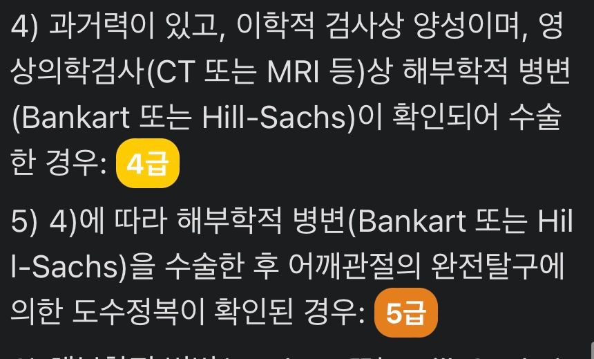5급은 수술 후 어깨가 다시 탈구되었을 때, 수술 없이 손으로 탈구를 제자리로 맞춘 경우이며, 좀 더 쉽게 설명하자면, 탈구가 다시 생겼고 이를 수술 없이 해결했는지에 따라 4급 5급이 나뉠것같습니다.