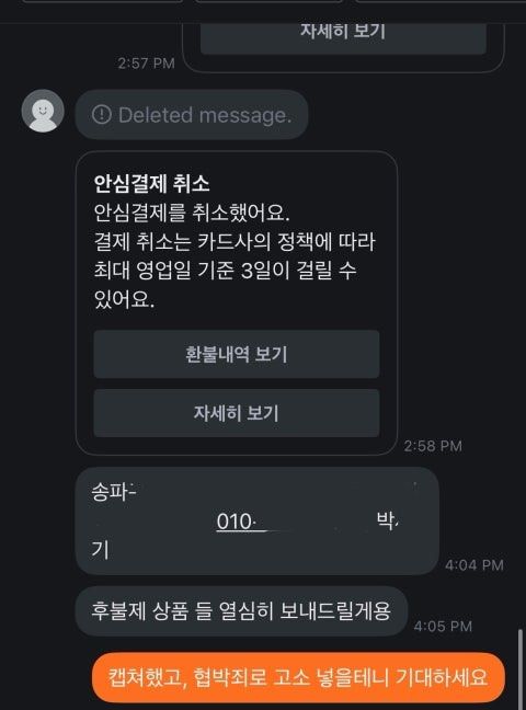 근데 그 이후에 제가 이전에 알려준 제 주소지랑 번호, 이름을 보낸 후에 후불 결제 기대하라고 메세지 보냈더군요. 협박죄로 고소 가능한지 궁금합니다. 합의금 필요없고 선처 없이 처벌 원하는데 가능할까요?