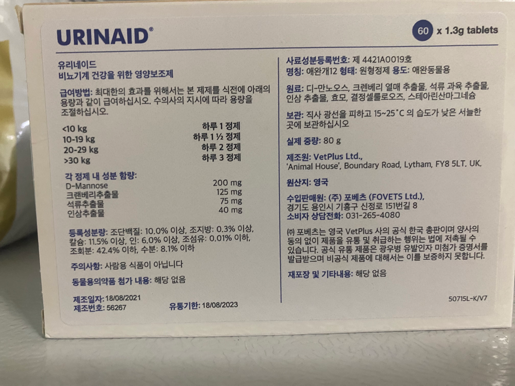 방광염 진단 받고 3주간 약 먹다가 수의사분께서 영양제를 한달 간 먹여보라 하셔서 사진에 유리네이드 제품 받아왔습니다. 다만 유통기한이 이번달 18일까지인 재고 밖에 없어서 먹는 도중 유통기한이 경과하게 되는데, 수의사분께선 그정도 유통기한은 지나도 괜찮다고 대신 반값 할인하여 주신다고 하여, 다른 병원을 다니는 것도 아니어서 그냥 받아왔습니다. 수의사분을 못 믿는 건 아니지만, 제가 원체 걱정이 너무 많은 성격이라(ㅠㅠ), 다른 분들의 의견도 여쭙고 싶어 글 올립니다. 8/1일부터 한달간 매일 2알씩 60정 먹여야하는데 유통기한 저정도 초과하는 건 큰 이상 없을까요?