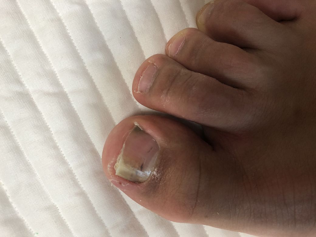 맞지 않는 축구화를 신고 축구를 하다가 발톱이 멍이 들었고 발톱이 빠진 후 다시 자란 발톱이 아래 사진과 같이 정상이 아니네요. 엄지 발가락 끝단 일부가 약간 살과 합체된 느낌입니다.색깔이 저런건 몇일전에 축구화 스터드에 밟혀서 저런 것입니다.