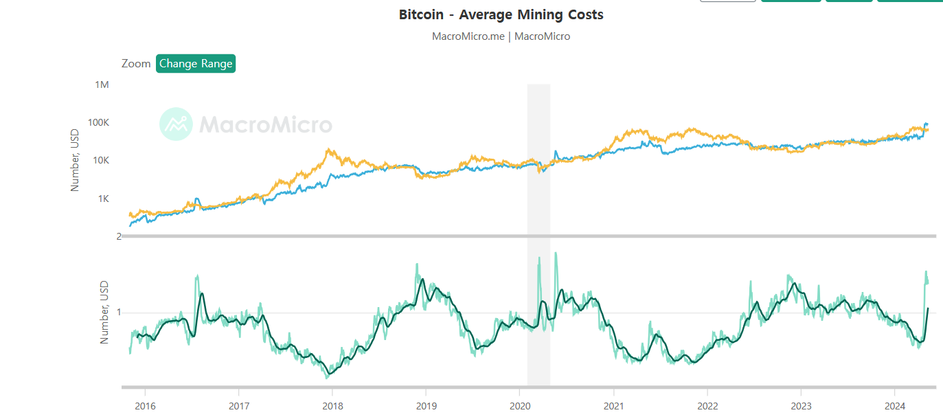 그리고는 채굴 평균 비용이 실제 비트코인 가격보다 높은지 낮은지 보구요.