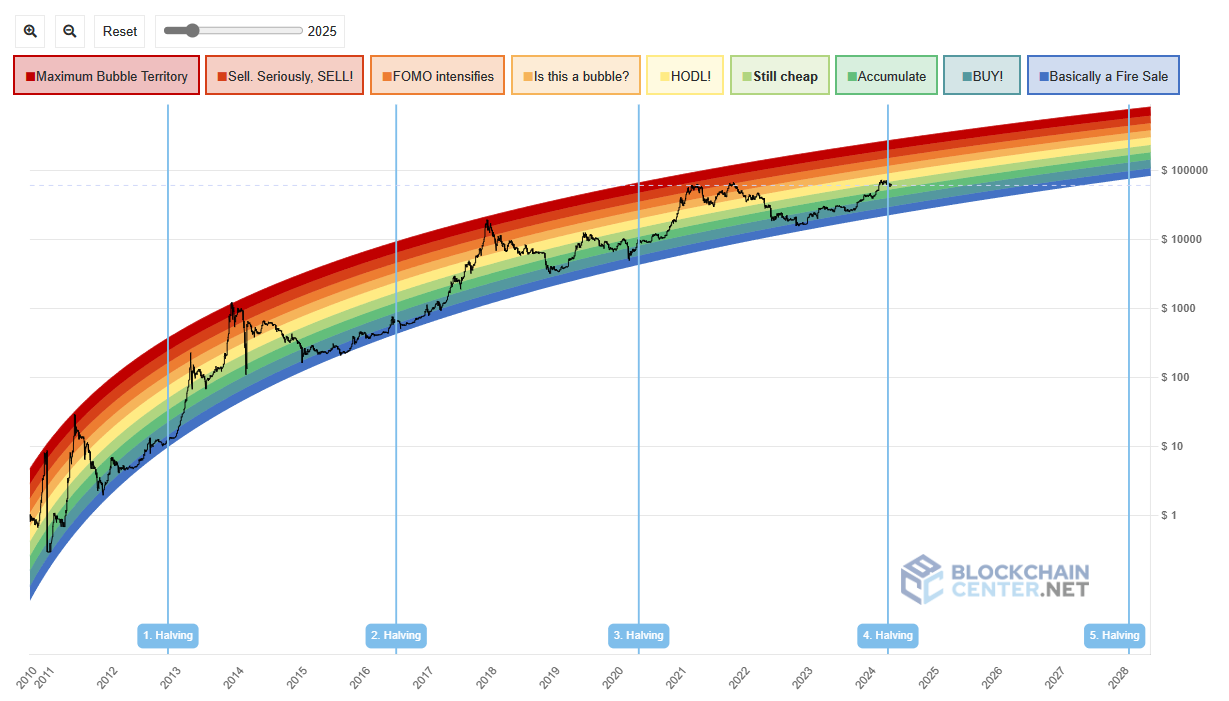레인보우 차트는 비트코인의 가격을 로그로 해서 성장기와 성숙기를 반영한 가격흐름을 단계 별로 나타내주는 차트입니다.